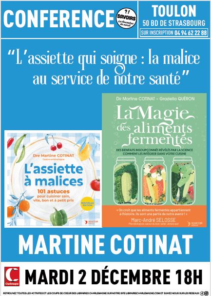 ![]() | Dans le cycle des rencontres et des conférences Savoir à la Librairie Charlemagne de Toulon Le Dr Martine COTINAT donnera une conférence Gratuite suivie de dédicaces sur « L’assiette qui soigne : La Malice au service de notre Santé » Comment retrouver une alimentation qui protège et qui soigne au milieu des nombreuses tentations de l’agroalimentaire ? Mardi 2 Décembre 2025 à 18h inscription recommandée en librairie, par téléphone au 04 94 62 22 88 ou en suivant le lien ci-dessous : JE M’INSCRIS À LA RENCONTRE ICI |